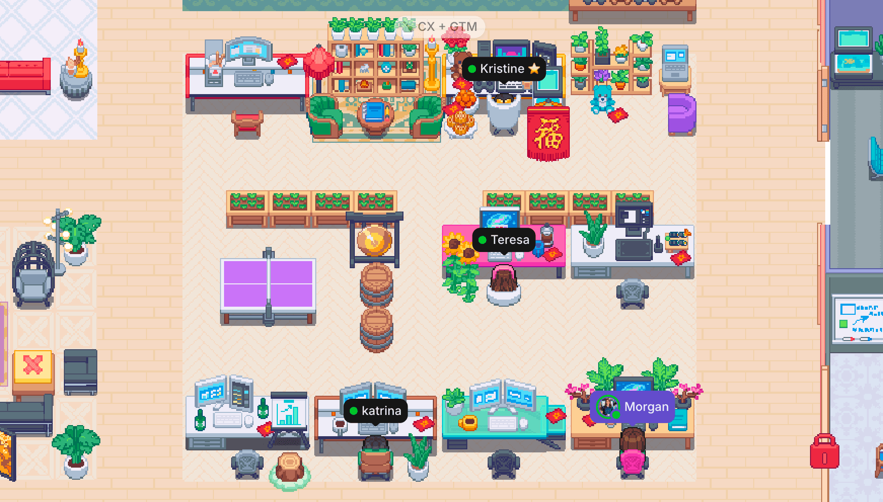 A group of desks in Gather’s own virtual office. You can really get a sense of everyone’s personality!
